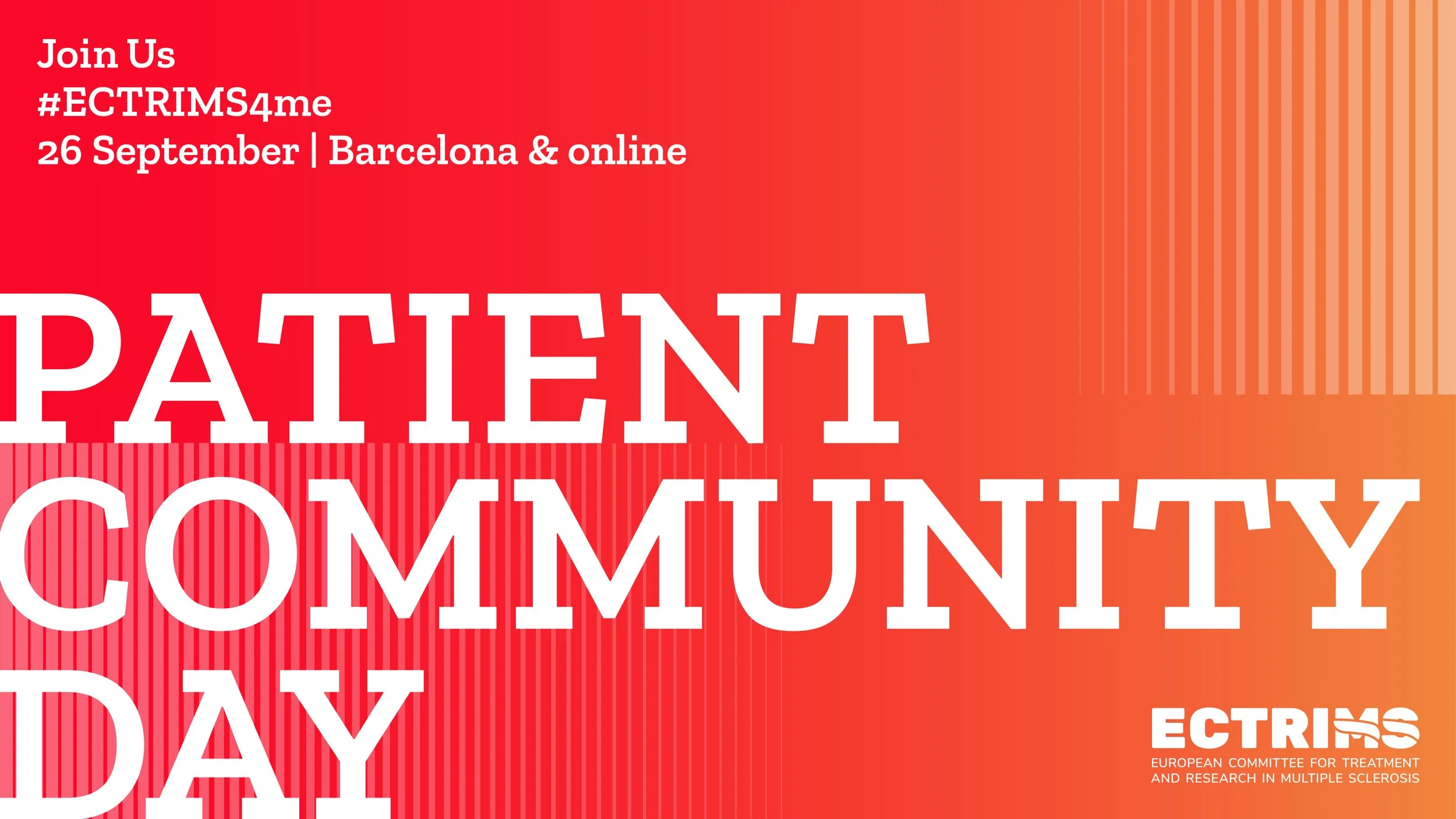 [ID: a red and oragne tile with text reading 'join us #ECTRIMS4me 26 September, Barcelona &online. Ask the expert - patient community day. Ask the expert. ECTRIMS: European Committee for Treatment and Research in Multiple Sclerosis. ]